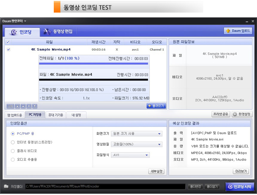 다음 팟인코더를 이용해 4K 동영상의 인코딩 테스트를 진행하고 있는 모습으로 3분 03초의 빠른 인코딩 시간을 보여주었다. (게이밍 노트북 수준의 빠른 인코딩 시간을 보여주었다.)