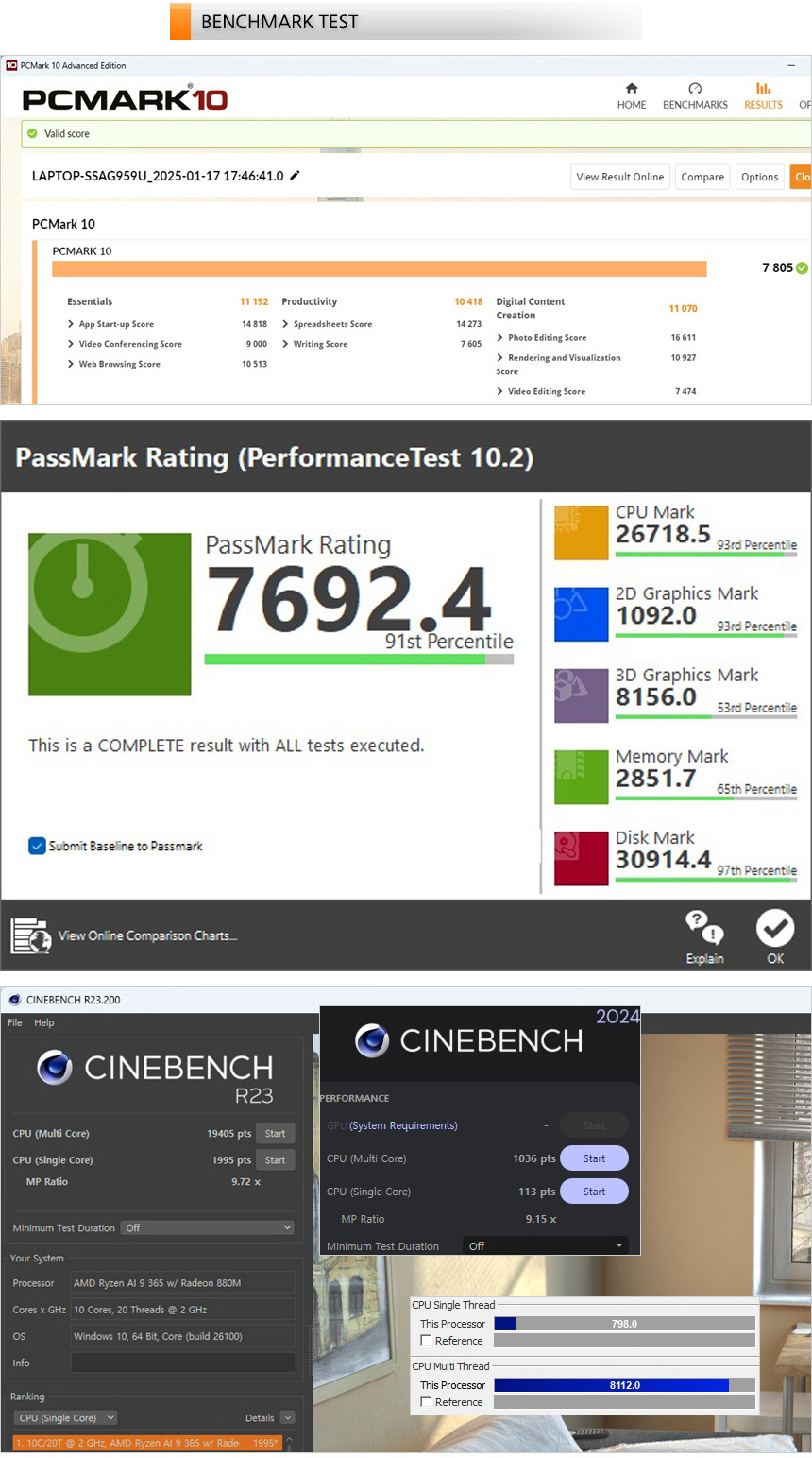 벤치마크 프로그램을 이용해 성능 테스트를 진행하고 있는 모습으로 기존에 테스트 했던 프리미엄 슬림 노트북들과 확연히 비교되는 높은 스코어를 보여주었다. 성능에 특화된 슬림 노트북이 필요하다면 탁월한 선택이 될 것이다.