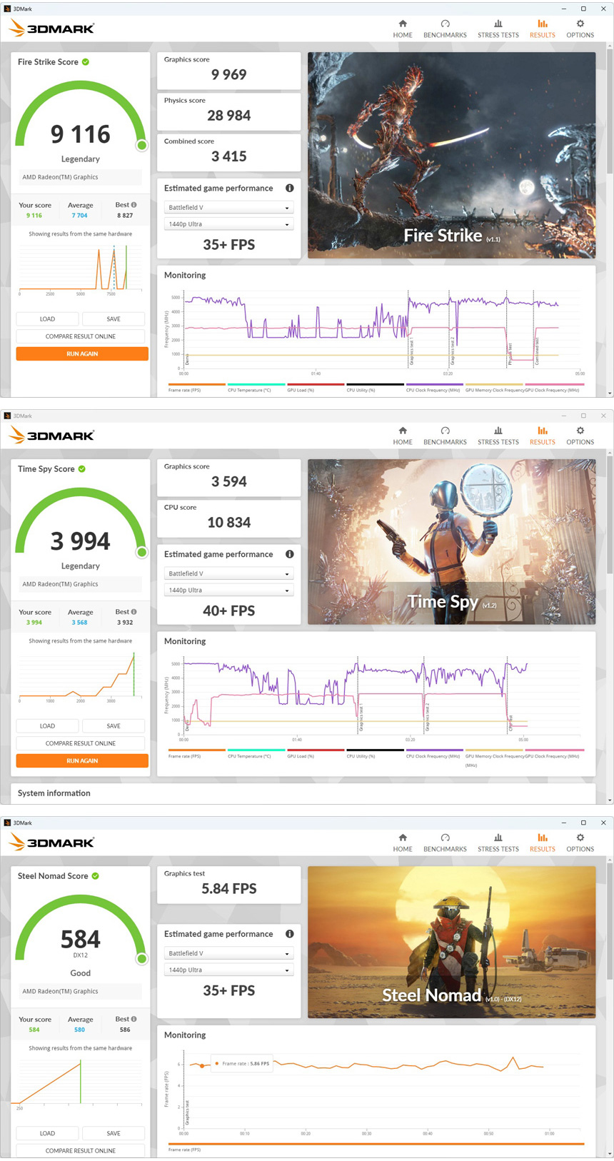 3DMARK를 이용해 3D 성능을 확인하고 있는 모습으로 파스 그래픽스코어가 만점에 육박할 정도로 높은 성능을 보여주었다. 최신 게임도 옵션 조정을 통해 부드럽게 즐길 수 있는 노트북이다.