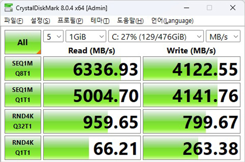 저장장치의 속도를 확인하고 있는 모습으로 PCIe 4.0 NVMe SSD를 탑재해 빠른 데이터 전송이 가능하며 512GB 대용량 지원으로 여유롭게 데이터를 저장할 수 있다.