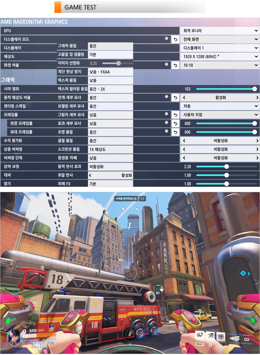 오버워치 2를 이용해 프레임 테스트 하고 있는 모습으로 WUXGA 해상도와 중간 옵션에서 145-194 프레임으로 플레이 되는 것을 확인할 수 있었다. 여유롭게 게임을 즐길 수 있을 것이다.