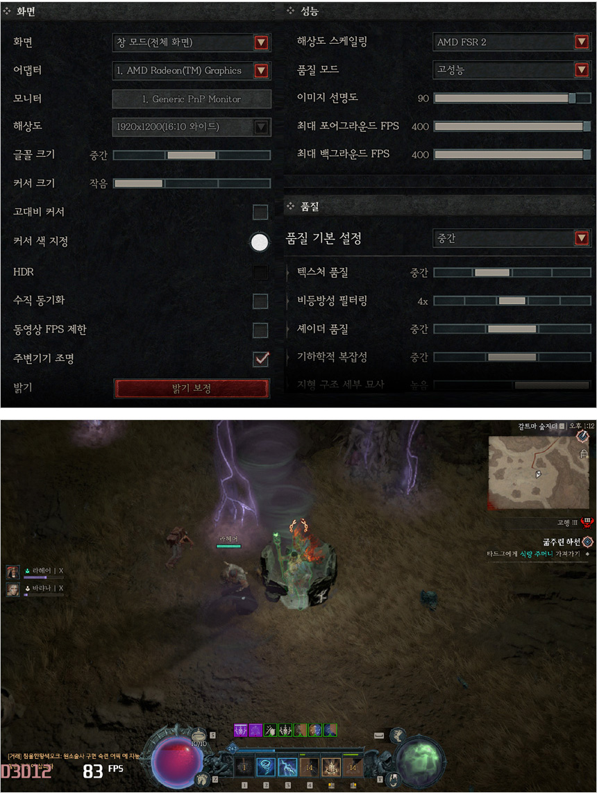디아블로 4를 중간 옵션에서 실행하고 있는 모습으로 FSR2를 고성능 으로 활성화 했을 때 73-101 프레임을 보여주어 부드럽게 게임을 즐길 수 있었다.