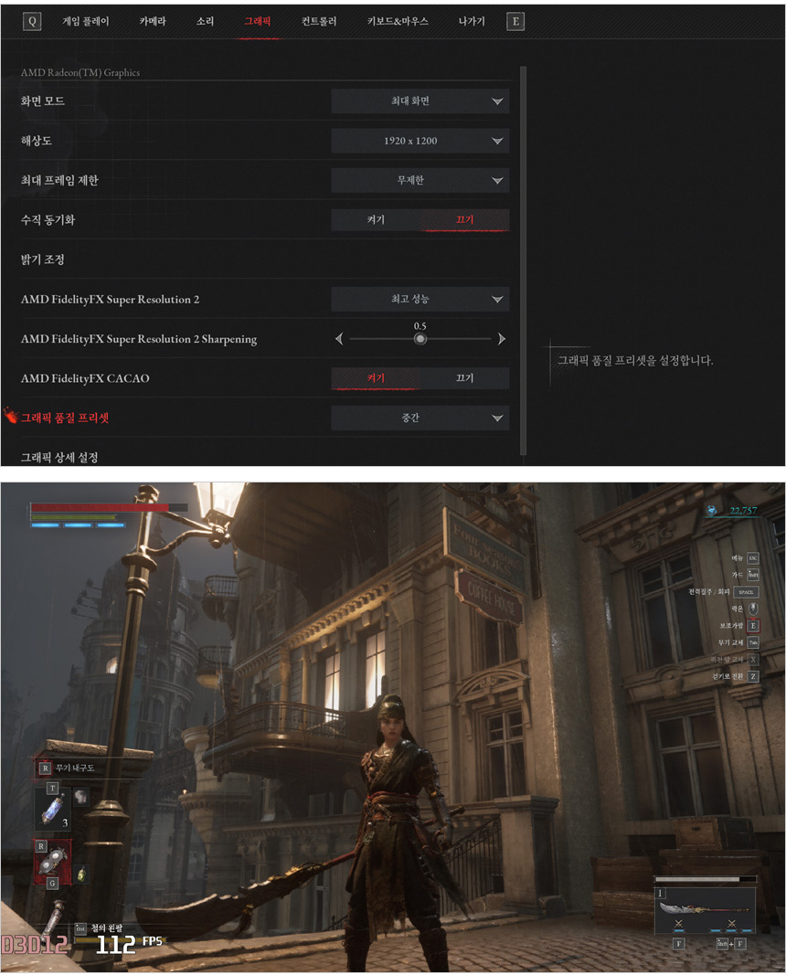국산게임 P의 거짓을 중간 옵션에서 플레이 하고 있는 모습으로 FSR2를 최고 성능으로 설정했을 때 74-107 프레임을 보여주어 불편없이 게임을 즐길 수 있었다. (동영상을 참조하기 바란다.)