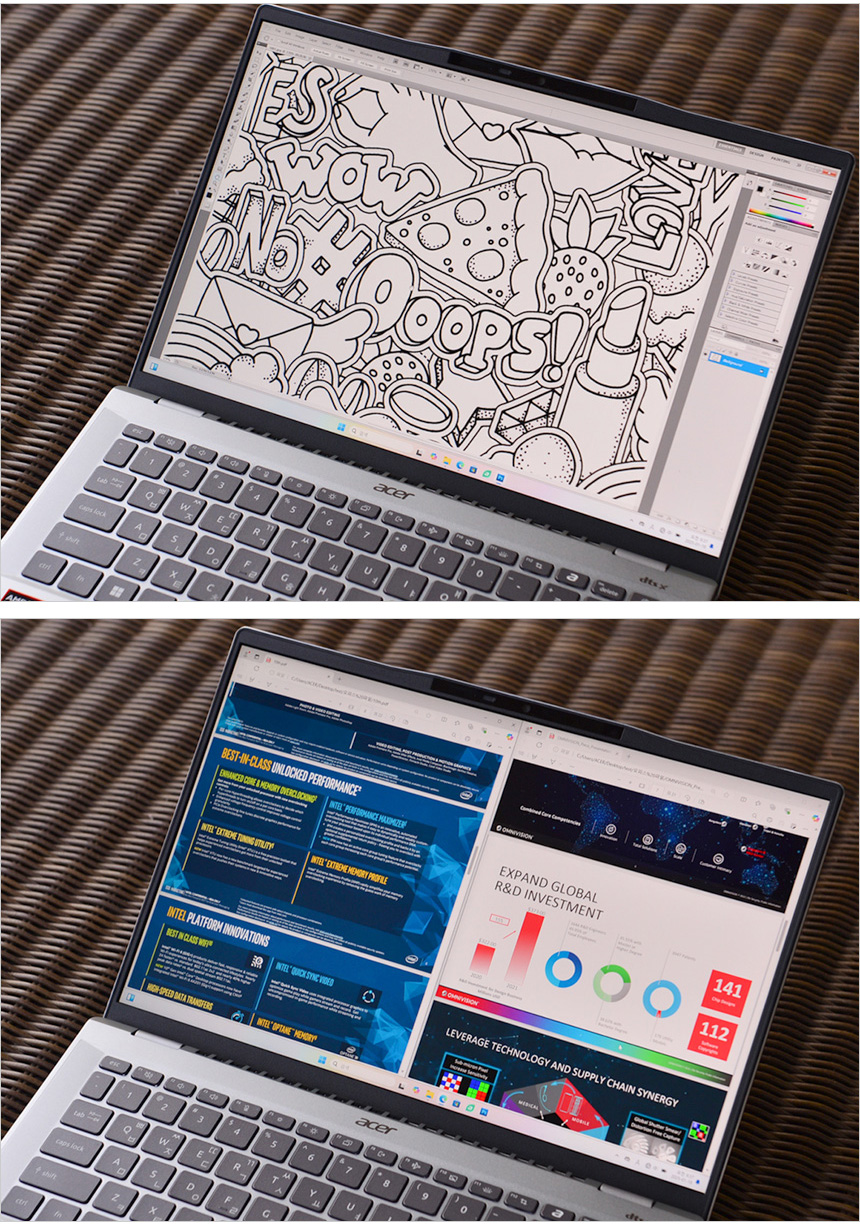 14형의 크기에 WUXGA (1920 x 1200) 해상도를 지원하며 sRGB 100% 색재현력 지원으로 디자인 등의 작업용으로도 충분히 활용할 수 있다. 또한 전용 S/W 인 AcerSence에서 아이케어 설정이 가능해 청색광으로부터 눈을 보호할 수 있으며 슬림베젤 지원으로 탁트인 시원한 영상을 즐길 수 있다. 뿐만 아니라 상단 중앙에는 QHD 웹캠과 마이크가 설치되어 HD 해상도의 일반 노트북을 압도하는 화질을 경험할 수 있다. (참고로 노이즈가 있는 픽셀을 감지해 더 나은 이미지를 제공하고 저조도에서 향상된 품질의 이미지를 제공하는 TNR 기술이 적용되어 있다.)