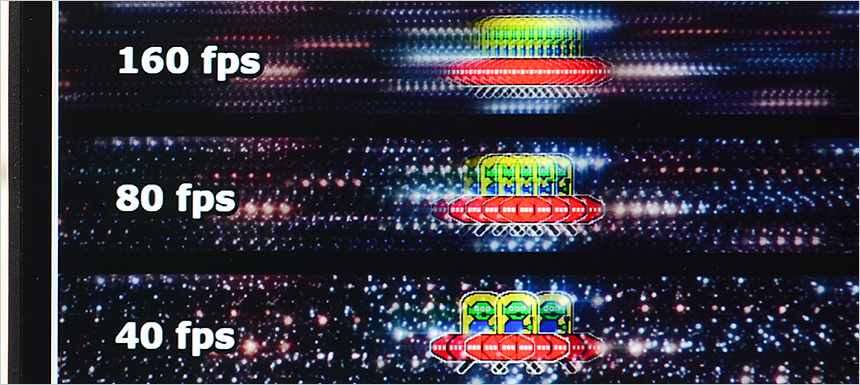 일반 모니터와 달리 160Hz의 높은 주사율을 지원해 깔끔하게 FPS 게임등을 즐길 수 있다. 상단의 사진은 160Hz 주사율을 쉽게 확인할 수 있도록 하위 프레임과 같이 재생되는 영상 (960 Pixel Per Sec) 을 셔터스피드 1/20 로 촬영한 모습으로 프레임이 높아질수록 시간당 많은 화면이 뿌려지기 때문에 캐릭터의 수가 많은 것을 확인할 수 있다. 직접 눈으로 영상을 볼 경우 160Hz 가 하위 프레임 대비 자연스럽게 움직인다.