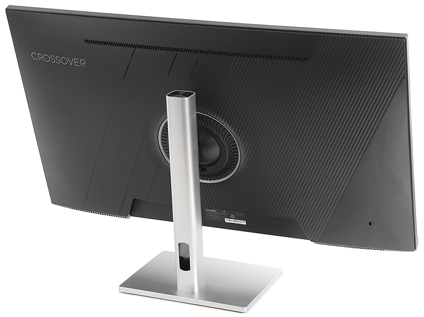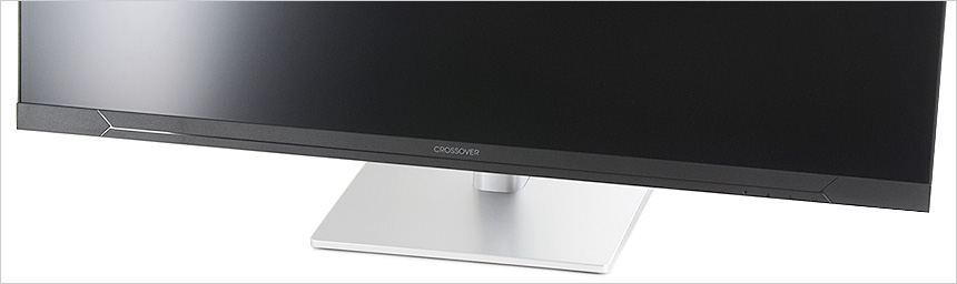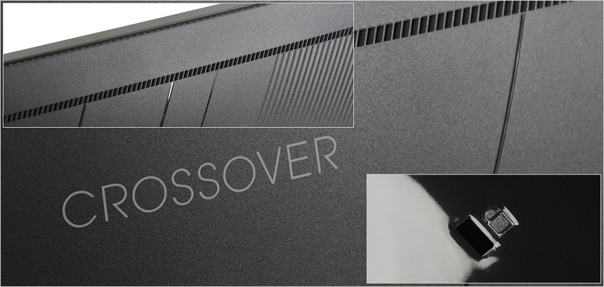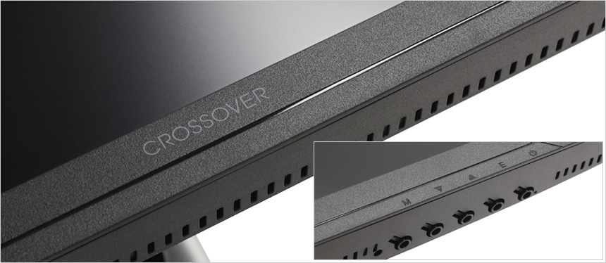 모니터 하단부의 모습으로 크로스오버 로고가 중앙에 세겨져 있으며 하단에는 OSD 버튼이 장착되어 모니터의 주요 기능을 손쉽게 조작할 수 있다. (참고로 무선리모콘을 기본 제공해 편의성을 높였다.) 또한 통풍구가 설치되어 있고 두 개의 3W 스피커가 장착되어 시원한 사운드를 즐길 수 있다.