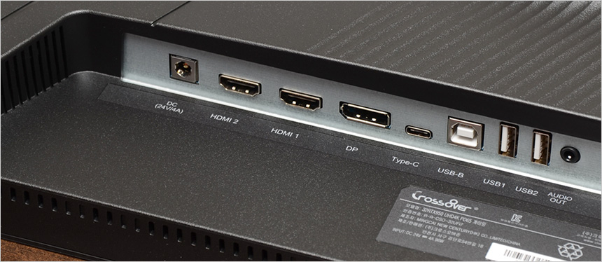 중앙에는 75mm 베사홀이 설치되어 벽에 걸거나 ARM 등에 장착해 사용할 수 있으며 (툴리스 방식의 받침대를 지원해 손쉽게 탈착할 수 있다.) 베사 연장볼트를 제공해 설치 편의성을 높였다. 또한 하단 중앙에는 DP 1.4 단자와 HDMI 2.1 단자를 지원해 PC는 물론 게임콘솔이나 IPTV, OTT 플레이어 등을 손쉽게 연결할 수 있으며 스마트폰이나 노트북 연결을 위한 C타입 단자도 제공된다. (PD충전 지원으로 연결과 동시에 디바이스가 충전된다.)