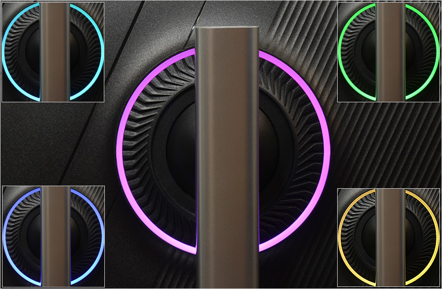 스탠드를 장착하는 후면 중앙에 RGB 백라이트가 적용되어 아름다운 조명효과를 즐길 수 있다. (OSD를 통해 컨트롤 할 수 있다.)