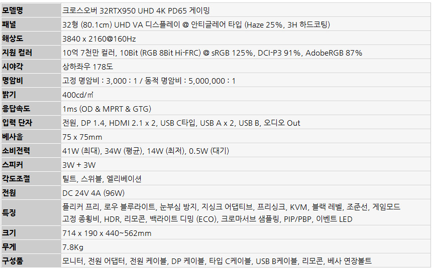 성능으로 승부하는 32형 4K 게이밍 모니터, 크로스오버 32RTX950 UHD 4K PD65 게이밍