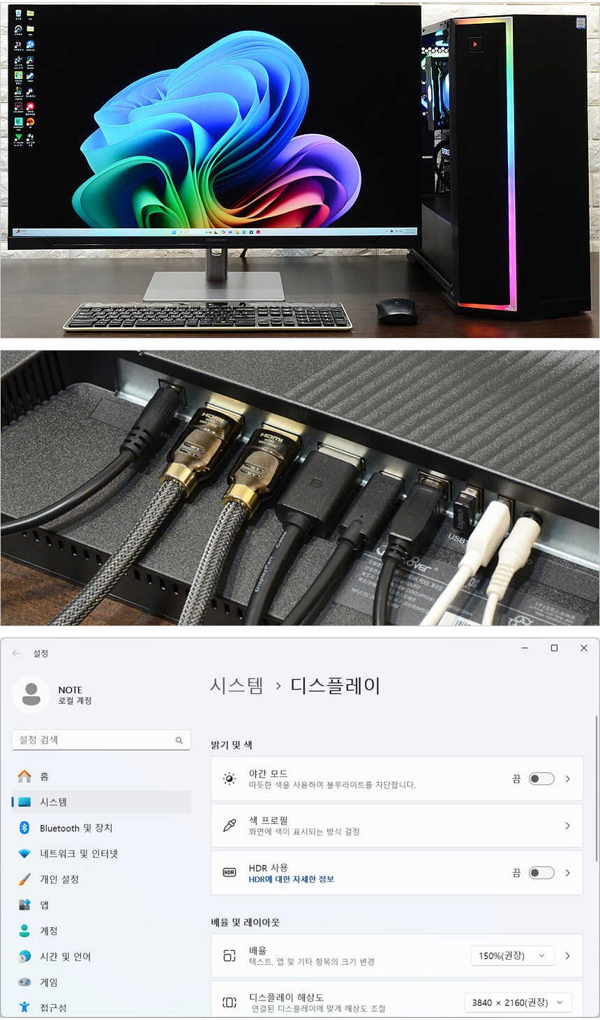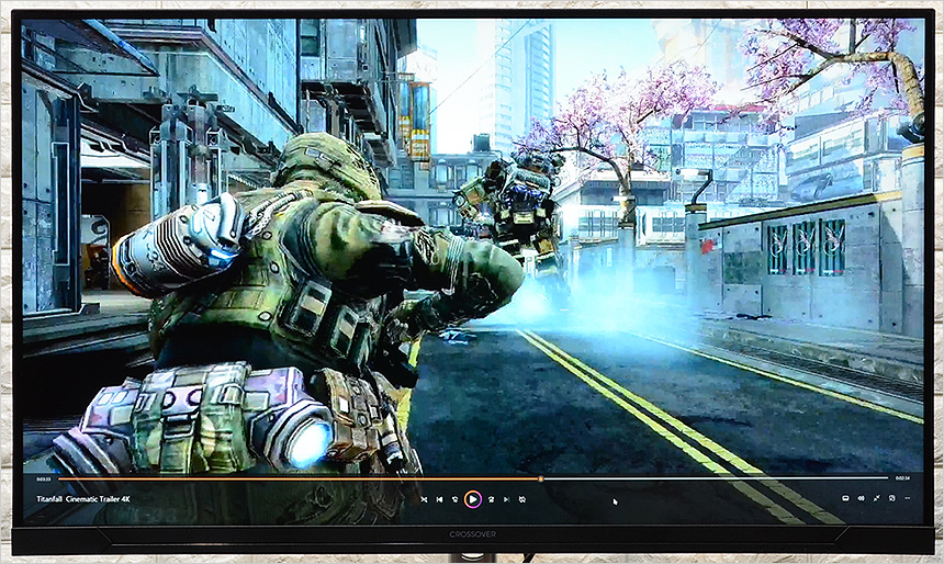테스트 프로그램을 이용해 화질 테스트를 진행하고 있는 모습으로 4K 특유의 디테일이 인상적이었으며 색이 진해 눈이 즐거웠다. (FHD 모니터와는 확연히 다른 영상을 보여준다.) sRGB 125%, DCI-P3 90%, AdobeRGB 87% 색영역을 지원하는 모니터로 게임 뿐만 아니라 멀티미디어 감상이나 심플한 작업용으로 충분히 사용할 수 있을 것이다. 또한 3,000:1 의 높은 망암비를 지원해 보다 자연스러운 명암 변화를 즐길 수 있으며 5백만대 1의 동적 명암비와 HDR 까지 지원해 사실적인 영상을 구현한다.