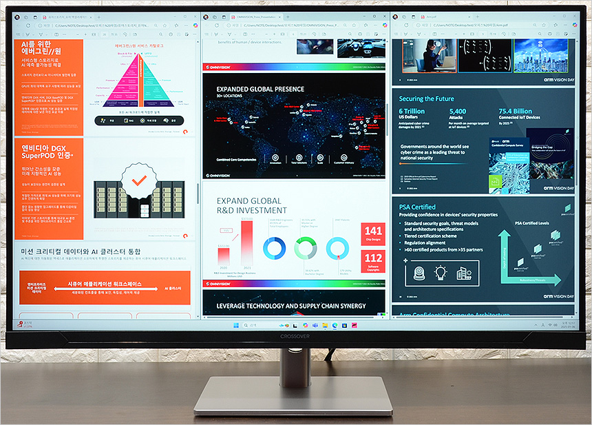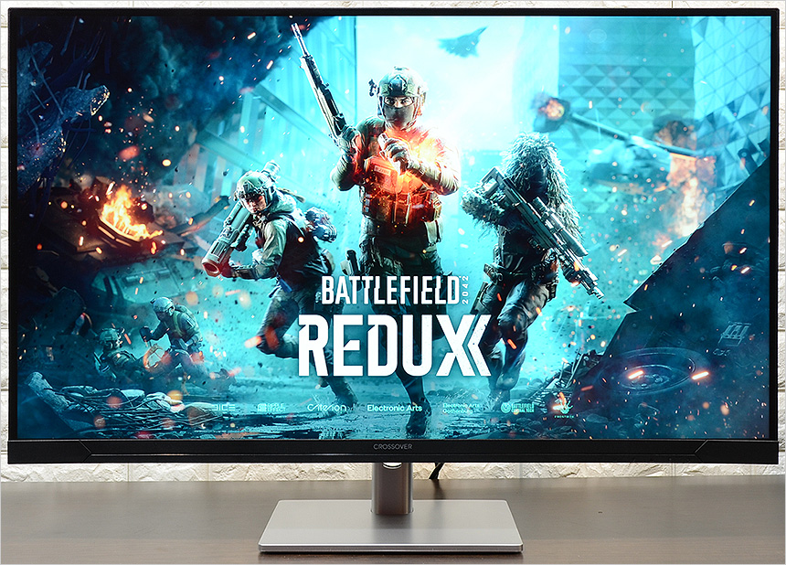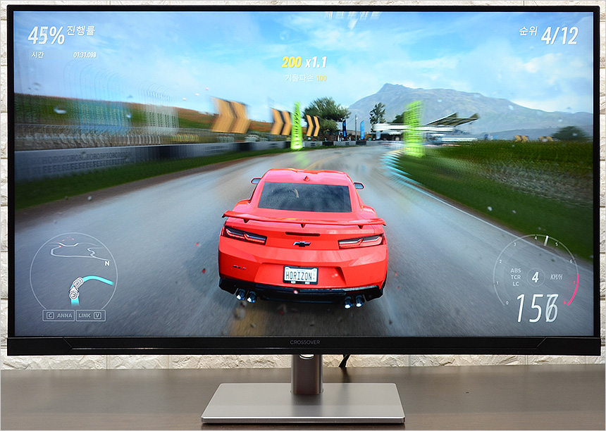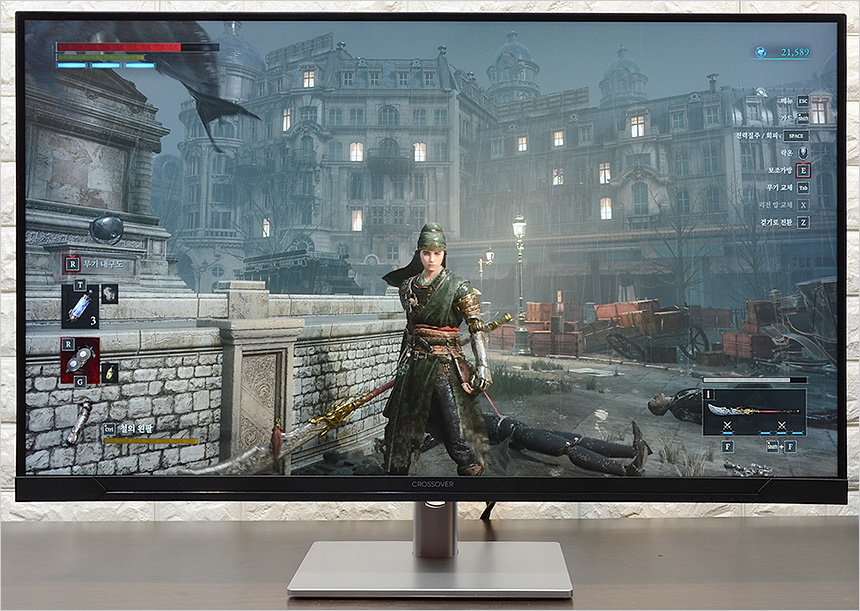 모니터 디자인은 크로스오버의 고급형 답게 세련되고 고급스럽다. 중후한 블랙에 실버 스탠드의 화사함이 더해져 세련된 분위기를 자아내며 후면에는 RGB LED를 적용해 게이밍 모니터 다운 화려함도 옅볼 수 있었다. 특히 높은 마감 완성도로 보급형 모델들과는 확연히 다른 고급스러움을 선사했다.