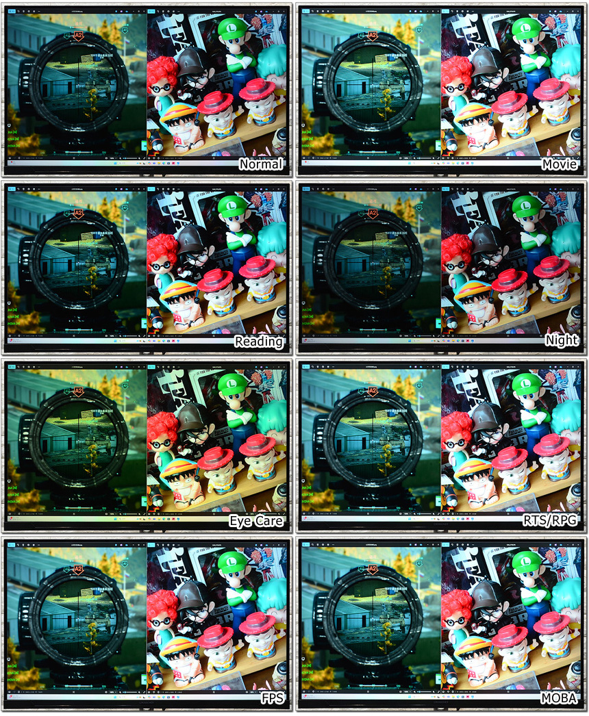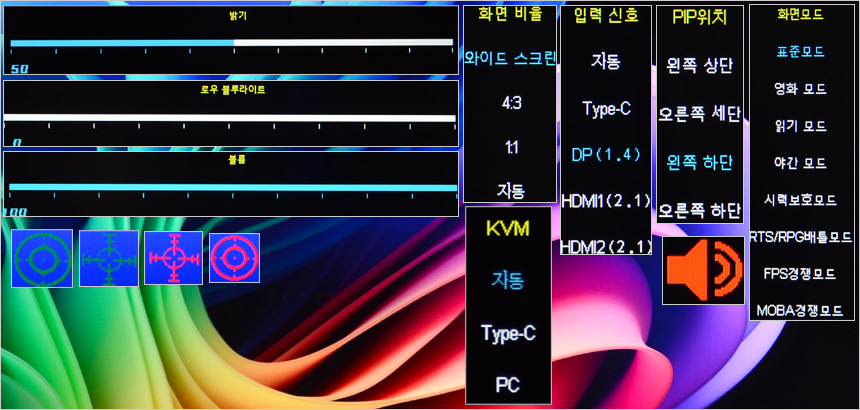 다양한 화면 모드를 제공해 편의성을 높였다. (최고급형 모델답게 다양한 설정을 지원한다.) 일일이 밝기와 명암등을 조정하지 않고 컨텐츠나 게임에 맞는 화질을 선택할 수 있다.