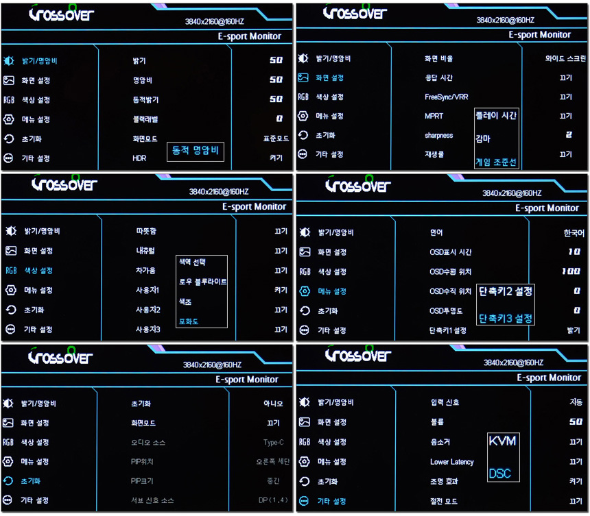 OSD 상세설정의 모습으로 밝기나 명암 설정이 가능하며 게임에서 유용하게 사용할 수 있는 블랙레벨, 응답시간, 프리싱크 등의 설정이 가능하다. 뿐만 아니라 색온도와 OSD, 볼륨, 후면 LED 설정을 지원한다. (PIP와 PBP, KVM도 설정할 수 있다.)
