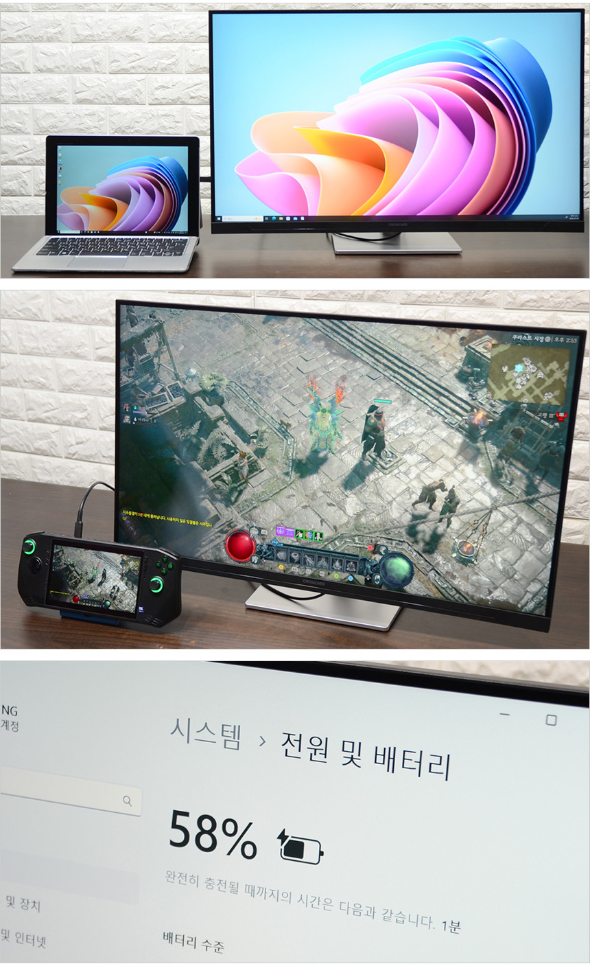 PD충전과 C타입 디스플레이 출력을 지원하는 노트북이나 게이밍 UMPC 등과 편하게 연결해 대화면으로 영상을 즐길 수 있다. 상단의 사진은 C타입 단자가 설치된 노트북과 UMPCU와 연결해 테스트를 진행하고 있는 모습으로 화면 출력은 물론 전원까지 공급되는 것을 확인할 수 있었다.