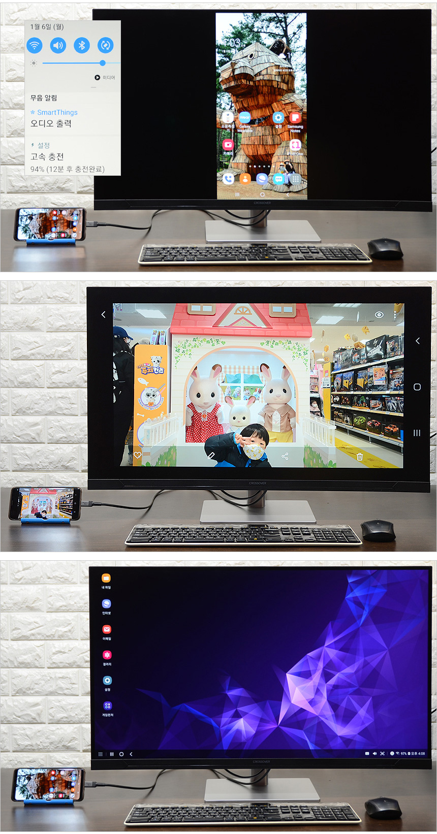 C타입 단자와 USB 단자 지원으로 사용성을 높인점도 큰 장점이라 할 수 있다. 미러링을 통해 대화면으로 스마트폰 영상을 즐길 수 있었으며 DEX 모드에서 키보드와 마우스 사용이 가능해 PC와 같은 사용성을 경험할 수 있었다. 또한 PD충전을 지원해 노트북이나 스마트폰과 연결시 영상출력 뿐만 아니라 배터리 까지 충전되며 KVM 기술을 적용해 하나의 키보드와 마우스로 두 대의 디바이스를 컨트롤 할 수 있다.