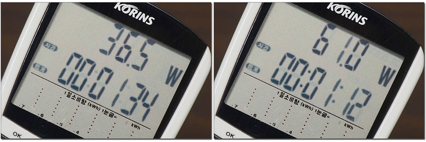 소비전력 테스트를 진행하고 있는 모습으로 100% 밝기에서는 61W 소비전력을 보여주었으며 50% 밝기에서는 36.5W로 소비전력이 낮아지는 것을 확인할 수 있었다. (후면에 LED까지 설치된 고성능 모니터로 일반 모니터 대비 소비전력이 높은 편이다.)