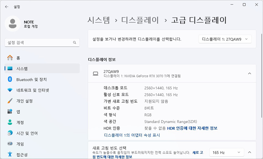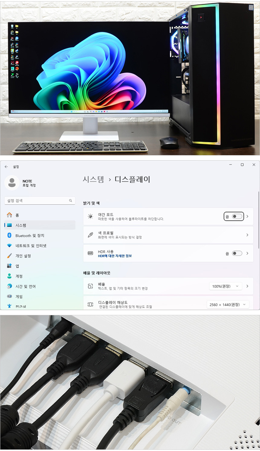 테스트를 위해 모니터를 책상에 설치한 모습으로 슬림 베젤을 적용해 30형 이상의 대화면 모니터와 달리 많은 공간을 차지하지 않았다. 책상공간이 협소 하더라도 불편없이 설치해 사용할 수 있을 것이다. 또한 HDR을 지원하는 모델답게 디스플레이 설정에서 HDR 적용이 가능한 것을 확인할 수 있다.
