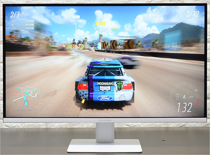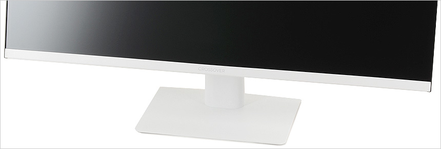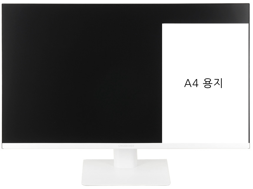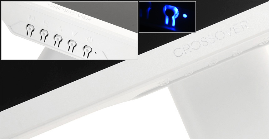 모니터 하단부의 모습으로 중앙에 크로스오버 레터링이 세겨져 있으며 전원 버튼과 상태표시 LED, OSD 버튼이 설치된 것을 확인할 수 있다. 이 제품은 사용자의 눈건강 까지 고려한 모델로 깜빡임으로 인한 눈의 피로를 최소화 하는 플리커 프리, 눈에 안좋은 영향을 미치는 블루라이트를 줄이는 블루라이트 감소 등의 아이케어 기술이 지원되어 안심하고 장시간 게임을 즐기거나 PC를 사용할 수 있다.