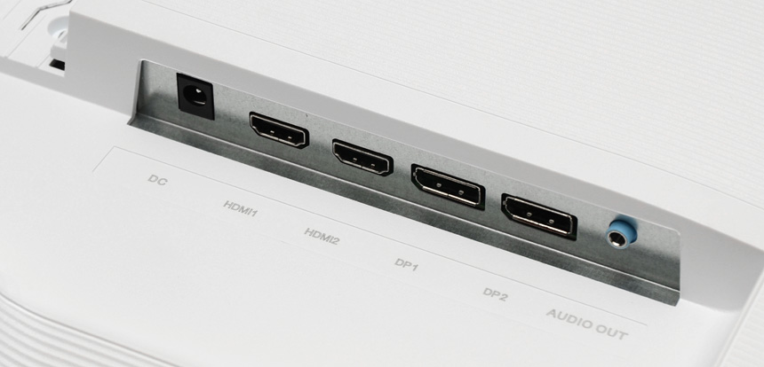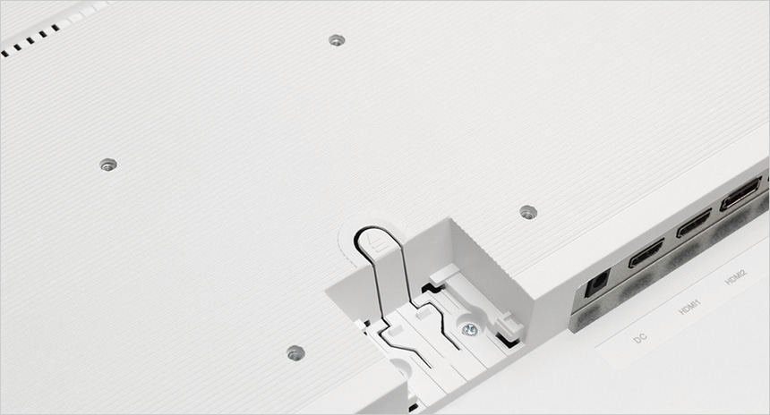 후면 중앙에는 100mm 베사홀이 설치되어 ARM에 장착하거나 벽에걸어 사용할 수 있으며 (스탠드는 툴리스 방식으로 손쉽게 탈부착 할 수 있다.) 하단 중앙에는 2개의 DP 와 HDMI 단자를 비롯해 오디오 OUT, 전원 단자가 설치되어 손쉽게 PC나 노트북 등과 연결해 활용할 수 있다.