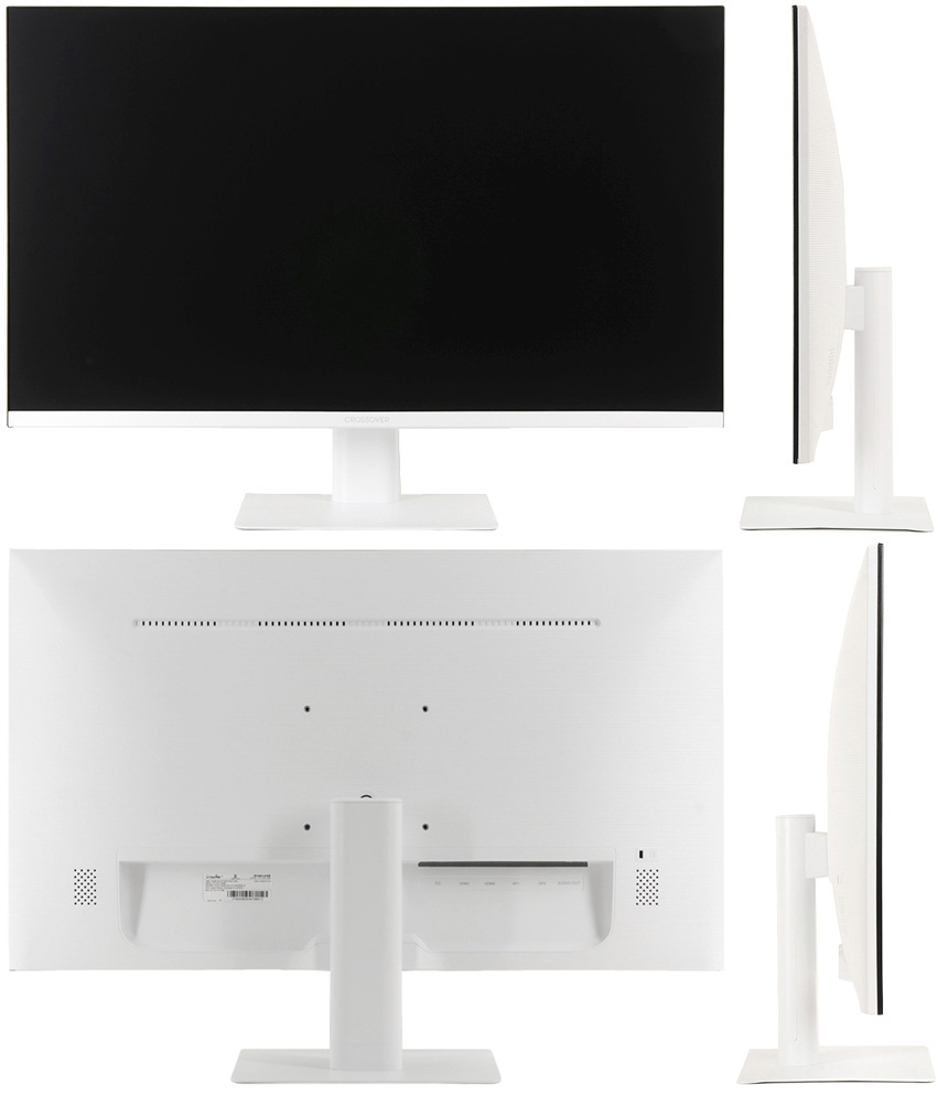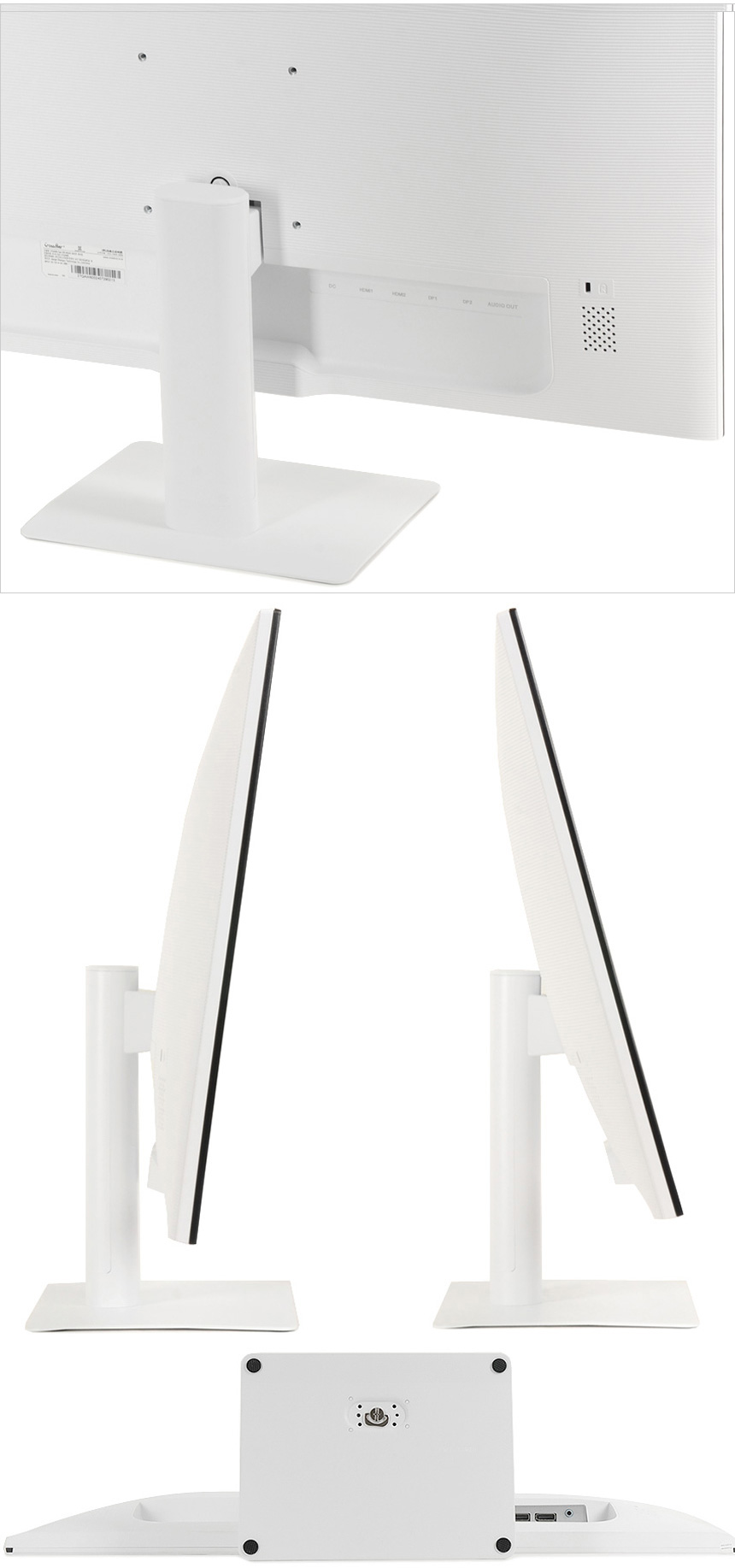 모니터의 디자인은 깔끔하고 고급스럽다. 화사한 화이트 컬러를 적용해 최근 유행하고 있는 화이트 PC와 좋은 궁합을 보여주며 보급형 모델들과는 비교되는 높은 마감 완성도를 보여주었다. 특히 후면은 패턴 처리가 되어있어 먼지나 지문이 잘 묻어나지 않는점이 마음에 든다.