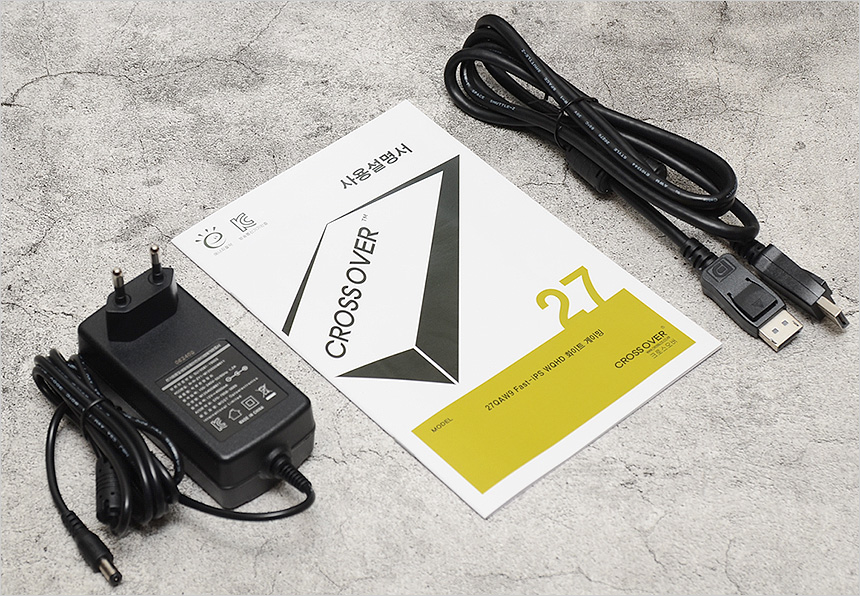 액세서리의 모습으로 케이블 일체형 전원 어댑터와 DP 케이블이 제공되며 사용 설명서가 포함되어 있다.