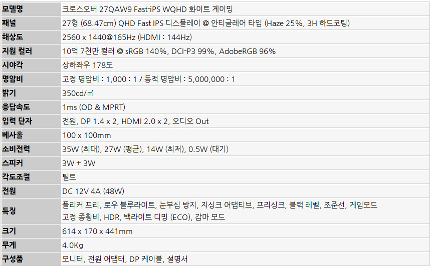화질이 중요한 게이머를 위한 모니터, 크로스오버 27QAW9 Fast-iPS WQHD 화이트 게이밍