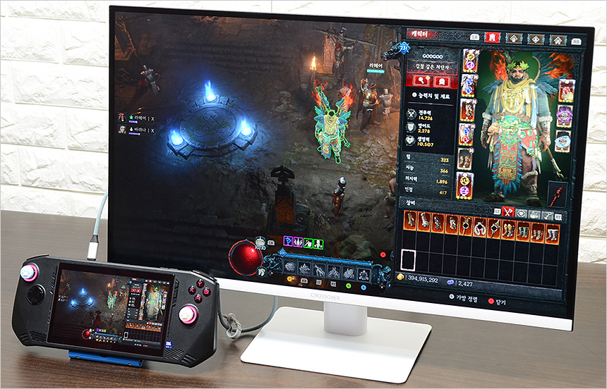 PS5 나 XBOX와 같은 게임콘솔과 연결해 게임을 즐길 수 있는 것은 물론 최근 많은 유저들이 사용하는 게이밍 UMPC와 연결해 대화면으로 게임을 즐길 수 있다. 상단의 사진은 게이밍 UMPC 연결 테스트를 진행하고 있는 모습으로 (HDMI to C타입 케이블 사용) 원활하게 동작하는 것을 확인할 수 있었다.