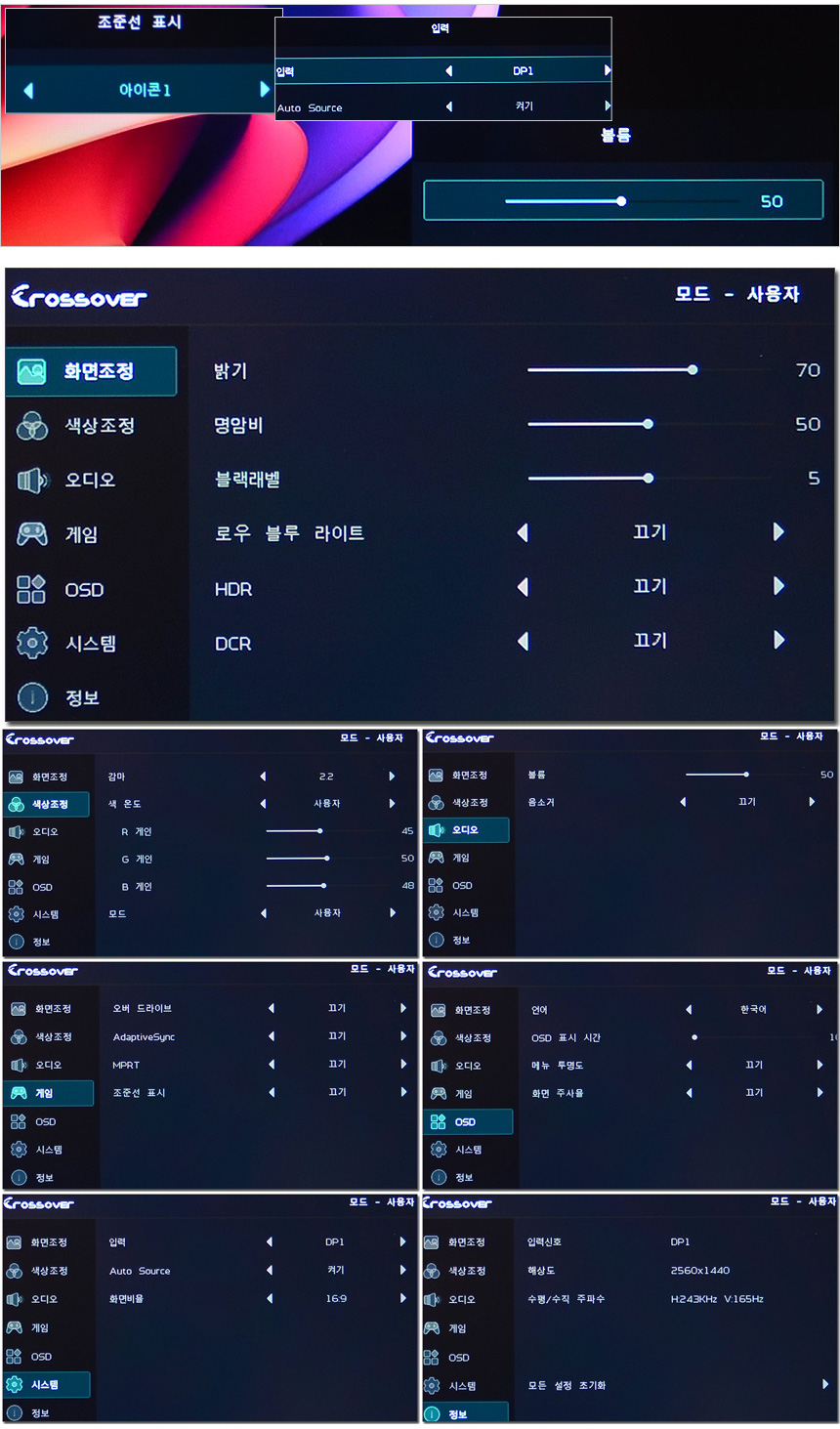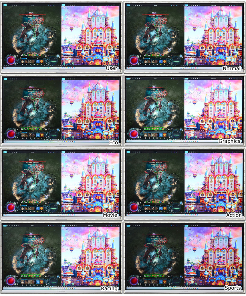다양한 화면모드 지원으로 게임이나 컨텐츠에 최적화된 영상을 즐길 수 있다. 상단의 사진은 다양한 모드를 비교한 모습으로 확연한 차이를 경험할 수 있었다.