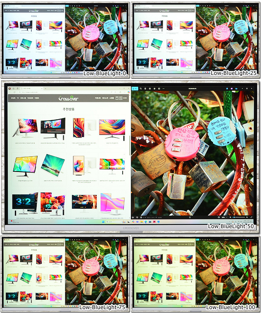 눈건강을 해치는 블루라이트 감소 기능을 제공한다. 상단의 사진은 테스트를 진행하고 있는 모습으로 설정에 따라 차이가 발생하는 것을 확인할 수 있다. (블루라이트가 감소하지만 색의 왜곡이 발생해 화려한 컬러의 게임이나 멀티미디어 감상 보다는 흰색 배경에서 작업이 이루어지는 웹서핑이나 오피스 등에서 사용하는 것을 권장한다.)