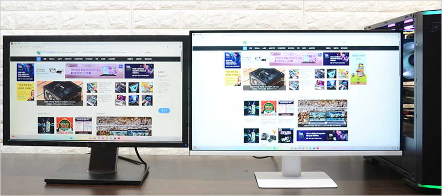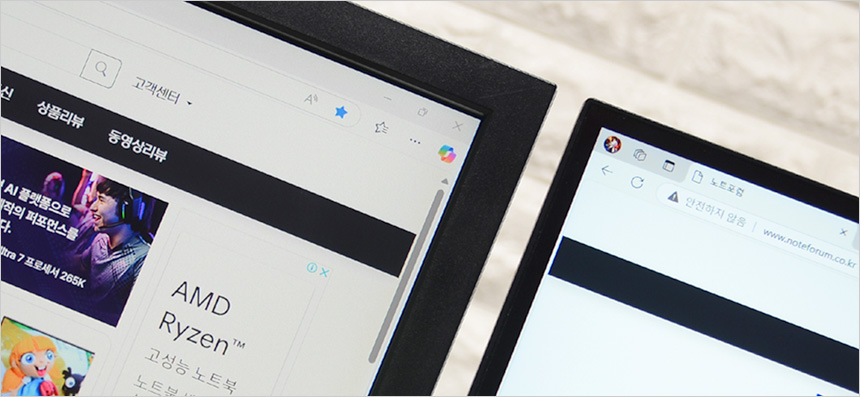 테스트 하는김에 두 모니터의 베젤 두께를 비교해 보았는데 사진과 같이 확연한 차이가 있는 것을 확인할 수 있었다.