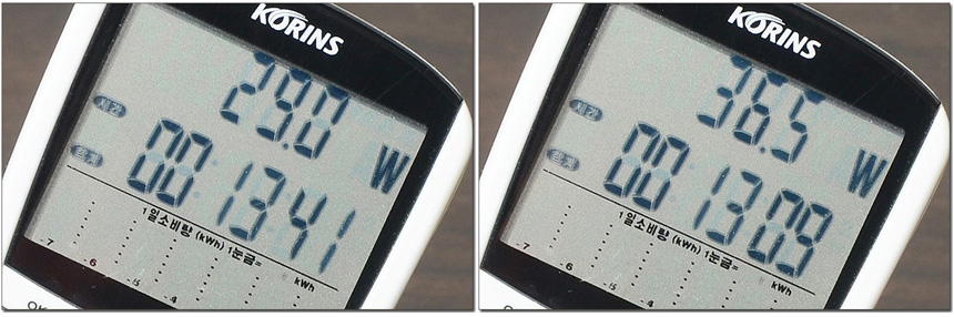 소비전력 테스트를 진행하고 있는 모습으로 밝기 50%에서 29W, 밝기 100%에서 36.5W의 전력소모를 보여주었다. (FHD 모니터 대비 소비전력이 높지만 부담스러운 수준은 아니다. 전기세 걱정없이 사용할 수 있을 것이다.)