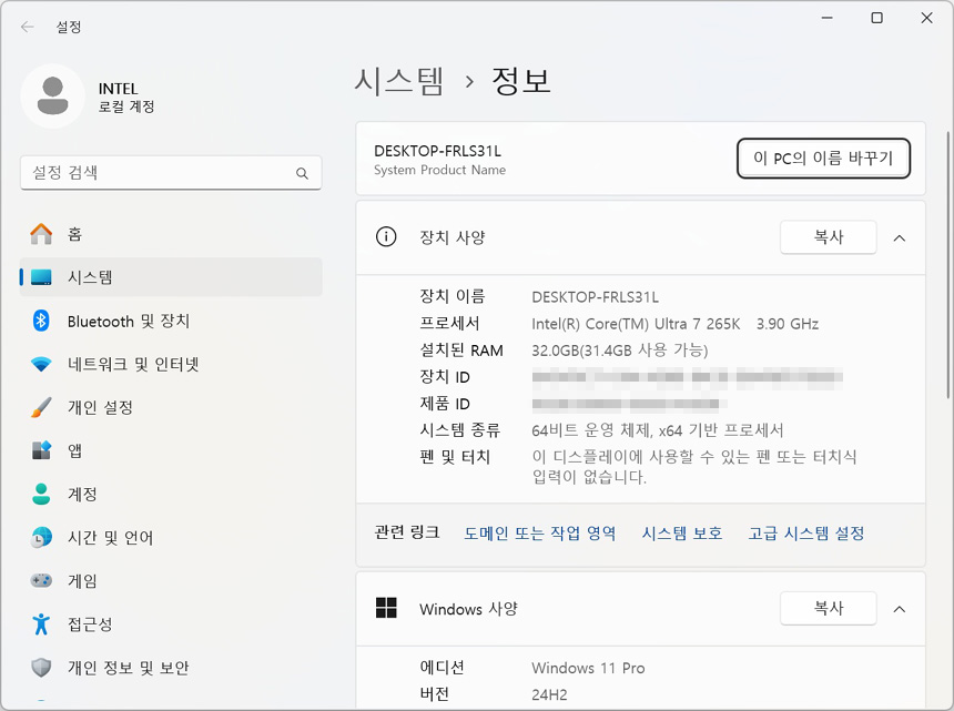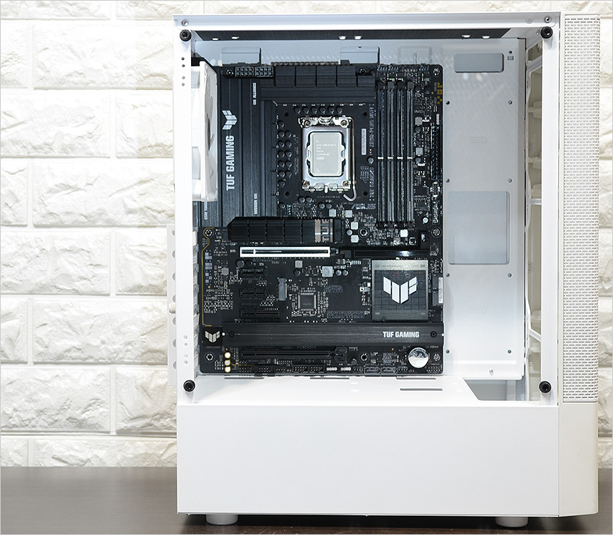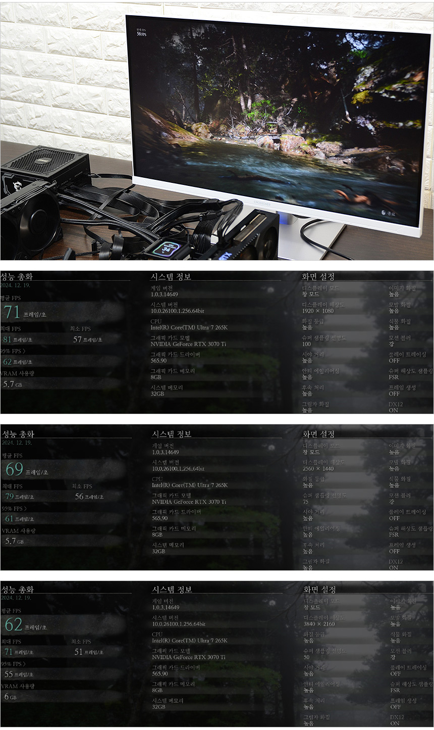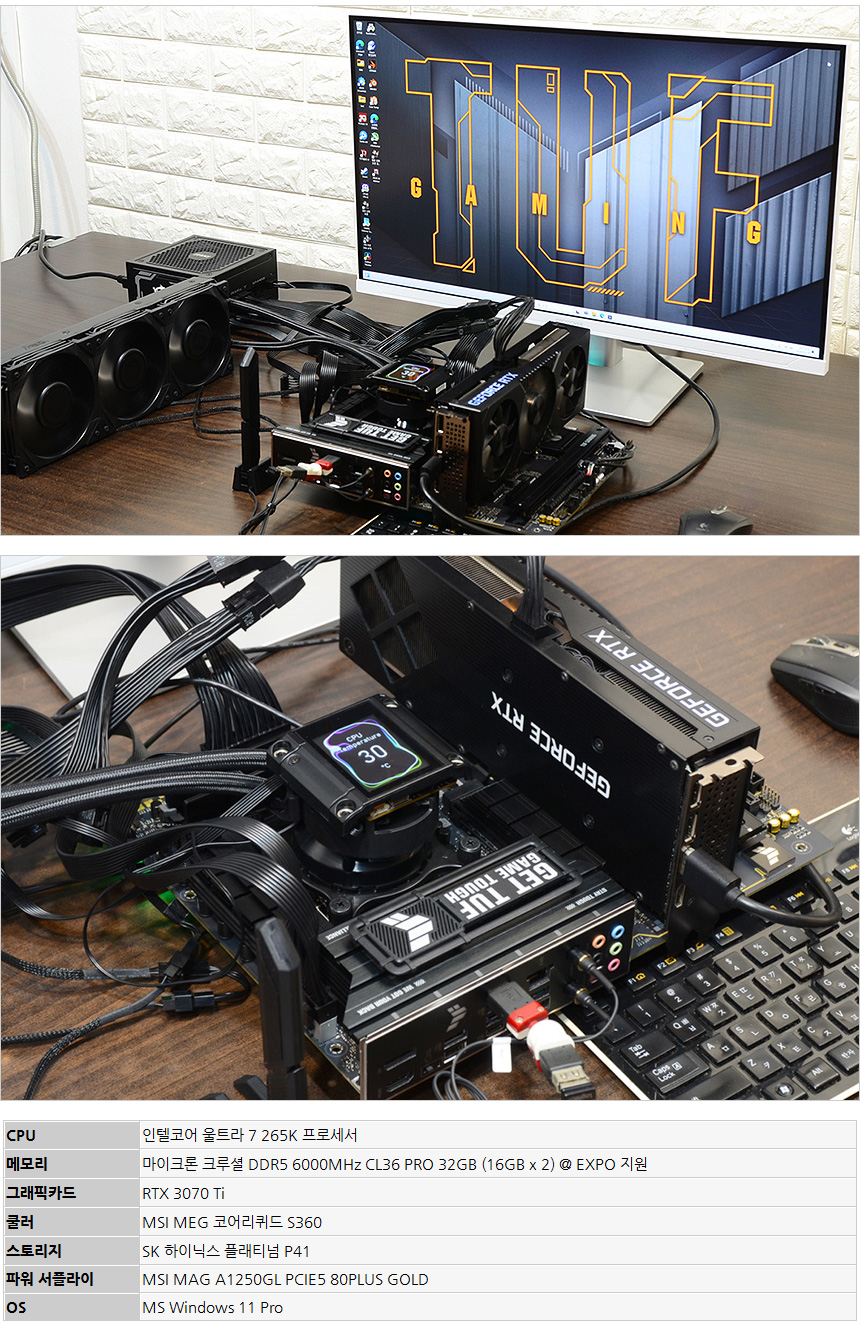 테스트를 위한 시스템의 모습으로 인텔코어 울트라 7 265K 프로세서를 사용했다. 또한 7000MB/s 의 빠른 속도를 보여주는 SK하이닉스 P41을 비롯해 넉넉한 전원 공급을 위해 MSI MAG A1250GL PCIE5 80PLUS GOLD 파워서플라이를 사용하고 XMP를 지원하는 오버클럭 메모리 마이크론 크루셜 DDR5 6000MHz CL36 PRO를 장착했다. (튜닝 메모리 구입후 XMP를 적용해 사용할 수 있으며 메모리 오버클럭을 통해 기본 메모리의 성능을 높일 수 있다.)