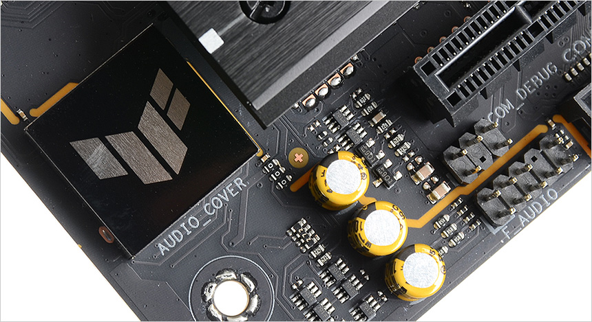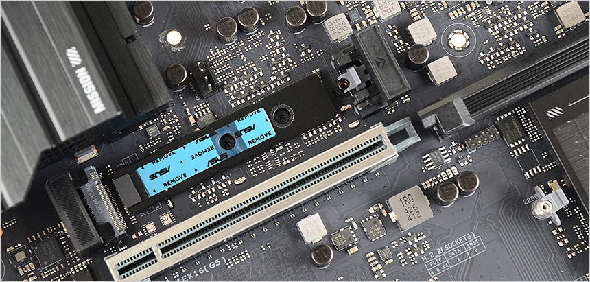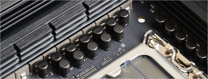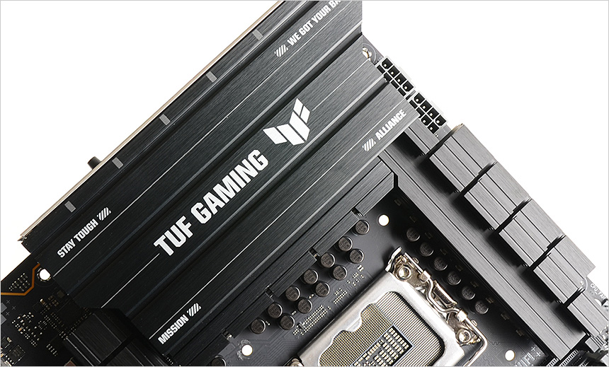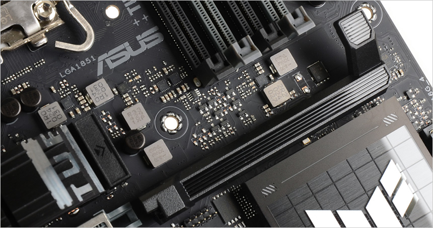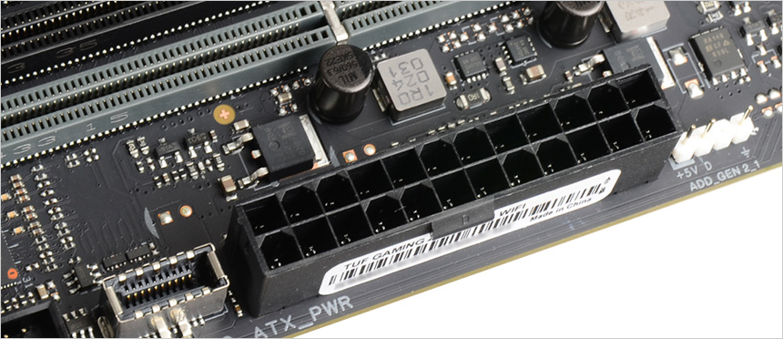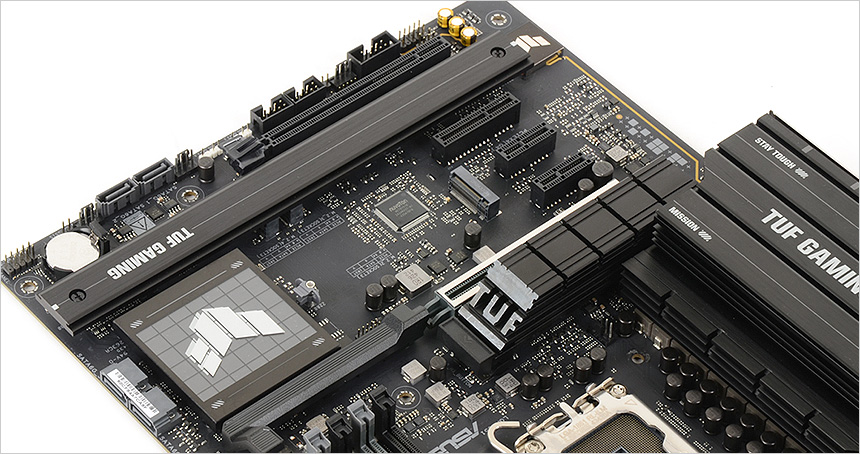전원부의 모습으로 고급형 메인보드 답게 대형 히트싱크를 장착해 안정성을 높였으며 (보급형 메인보드의 경우 히트싱크를 지원하지 않거나 크기가 얇거나 작다.) 16+1+2+1 의 프리미엄 파워 디자인을 적용해 안정적으로 전력을 공급한다. 이 제품은 8층 PCB 설계로 안정성을 높이는 동시에 오버클러킹을 강화 했으며 TUF 초크와 캐페시터는 높은 내구성과 안정성을 제공한다.