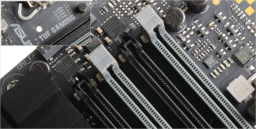 4개의 메모리 슬롯이 제공되는 것을 확인할 수 있다. 최대 192GB 까지 용량을 확장할 수 있어 대용량 메모리를 필요로 하는 전문작업용으로도 활용할 수 있으며 듀얼채널을 위한 메모리 장착시 쉽게 구분할 수 있도록 슬롯에 2개의 컬러를 적용한 것이 눈에 띈다. (2개의 메모리를 사용할 경우 회색 슬롯에 장착해 주면 된다.)