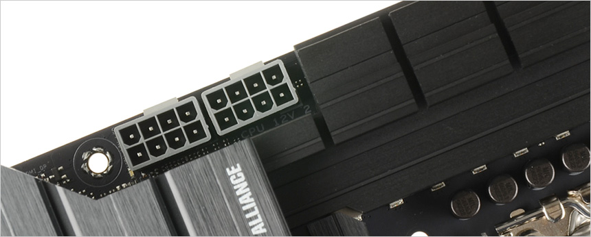 전원 단자의 모습으로 통합 전원공급을 위한 24핀 전원 단자가 설치되어 있고 (전원 케이블과 완전히 접촉하도록 설계되어 핫스팟 및 커넉터 고장을 방지한다.) 8+8핀 CPU 전원 단자도 지원하는 것을 확인할 수 있다. (ProCool 전원 커넥터를 적용해 파워서프라이와의 연결성을 높였다.)