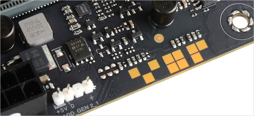 메인보드 우측 상단의 모습으로 공랭쿨러 사용을 위한 CPU 핀 헤드는 물론 많은 유저들이 사용하고 있는 수랭쿨러도 편하게 활용할 수 있도록 펌프 핀 헤더도 제공되는 것을 확인할 수 있다. (라디에이터를 식혀주는 쿨링팬 케이블은 CPU_OPT 핀 헤더에 연결하면 된다.) 또한 PC케이스와 팬의 LED 연동을 위한 ADD GEN2 헤더가 설치된 것도 확인할 수 있다.