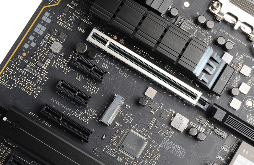총 5개의 슬롯을 제공해 그래픽카드는 물론 다양한 PCIe 주변기기를 연결할 수 있다. (단, 대형 그래픽카드 사용시 중앙에 있는 PCIe 4.0 슬롯은 사용하지 못할 수 있다.) 그래픽카드 장착에 사용되는 PCIe 5.0x16 슬롯은 강화금속으로 구성되어 무거운 그래픽카드 장착시 파손이나 휘어짐 등을 방지하며 PCIe 슬롯 Q-릴리즈를 적용해 그래픽카드를 쉽게 분리할 수 있다. (동영상을 통해 자세히 확인하기 바란다.)