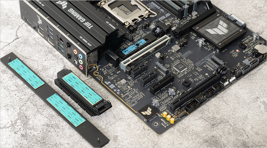 4개의 M.2 슬롯을 지원해 손쉽게 저장 용량을 확장할 수 있다. 메인 슬롯은 PCIe 5.0을 지원해 초고속 데이터 전송이 가능하며 다른 슬롯들도 PCIe 4.0을 지원해 빠른 속도를 즐길 수 있다. 특히 메인 슬롯에는 아주 두꺼운 방열판이 제공되어 열이 많은 NVMe SSD를 안정적으로 사용할 수 있다.