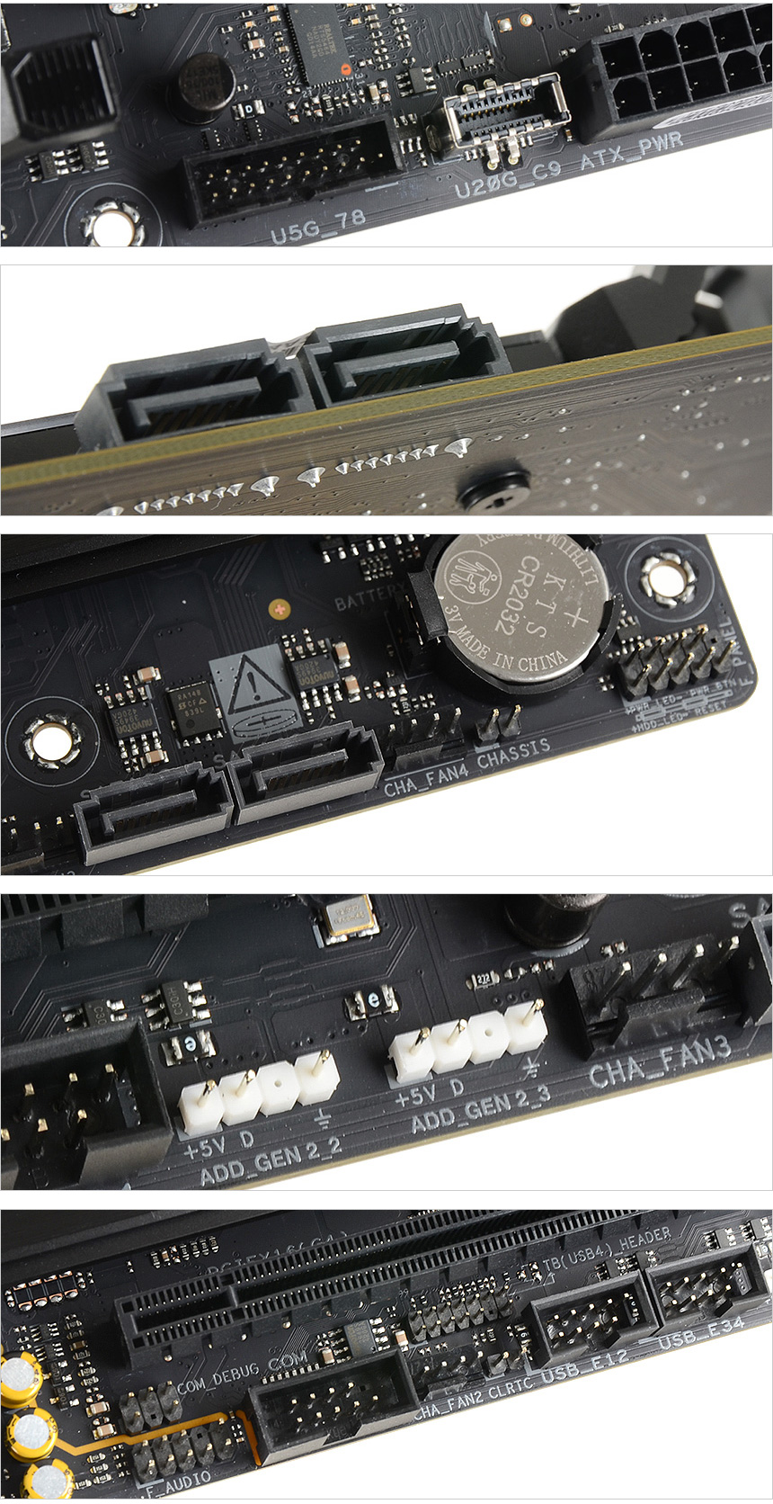 20Gbps 와 5Gbps 커넥터가 전원 커넥터 측면에 설치된 것을 확인할 수 있으며 주변기기 연결을 위한 2개의 USB 2.0 헤더가 설치된 것을 확인할 수 있다. 또한 4개의 SATA 슬롯을 제공해 HDD를 편하게 연결할 수 있으며 오디오와 시스템, 디버그, AURA RGB, 시스템 팬을 위한 핀 헤더가 장착된 것을 알 수 있다.