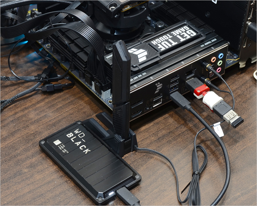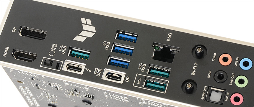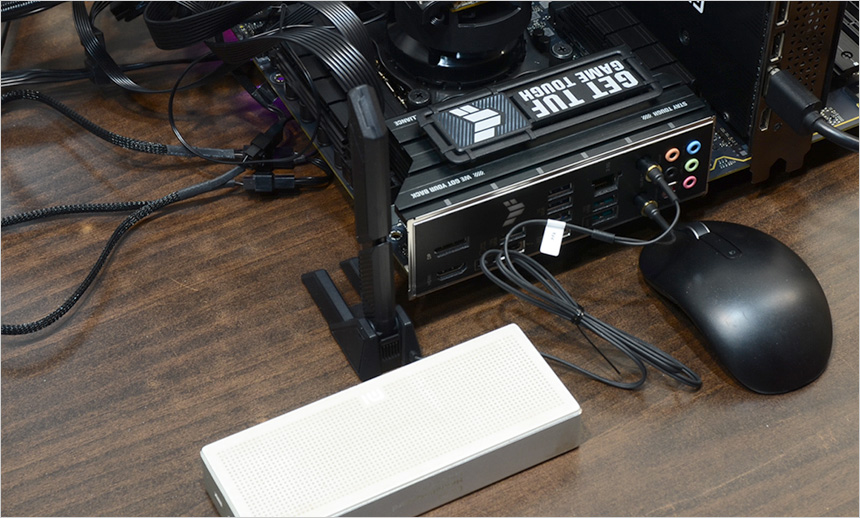S/PDIF를 포함한 오디오 단자가 설치되어 있고 2.5G 이더넷 단자와 Wi-Fi 7 무선랜 사용을 위한 2개의 안테나 단자가 설치되어 있는것도 눈에 띈다. (볼트를 돌려주어야 했던 예전과 달리 밀어주면 자동 장착되도록 설계해 편의성을 높였다.)