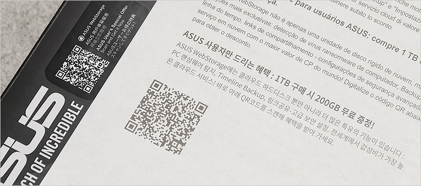 기본 제공되는 액세서리의 모습으로 퀵 매뉴얼과 스티커, WIFI 안테나, 2개의 SATA 케이블 등을 제공하며 디자인 커버와 스탠드오프, 볼트 등이 포함된 것을 확인할 수 있다. 또한 메인보드 사용자를 위해 웹스토리지를 제공한다.