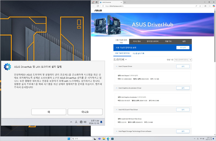 PC를 셋팅하면 자동으로 드라이버 허브와 LAN 드라이버 설치 알림이 활성화 된다. 랜선을 연결하면 프로그램과 드라이버가 설치되며 ASUS 홈페이지로 이동해 손쉽게 다른 드라이버를 설치할 수 있다.