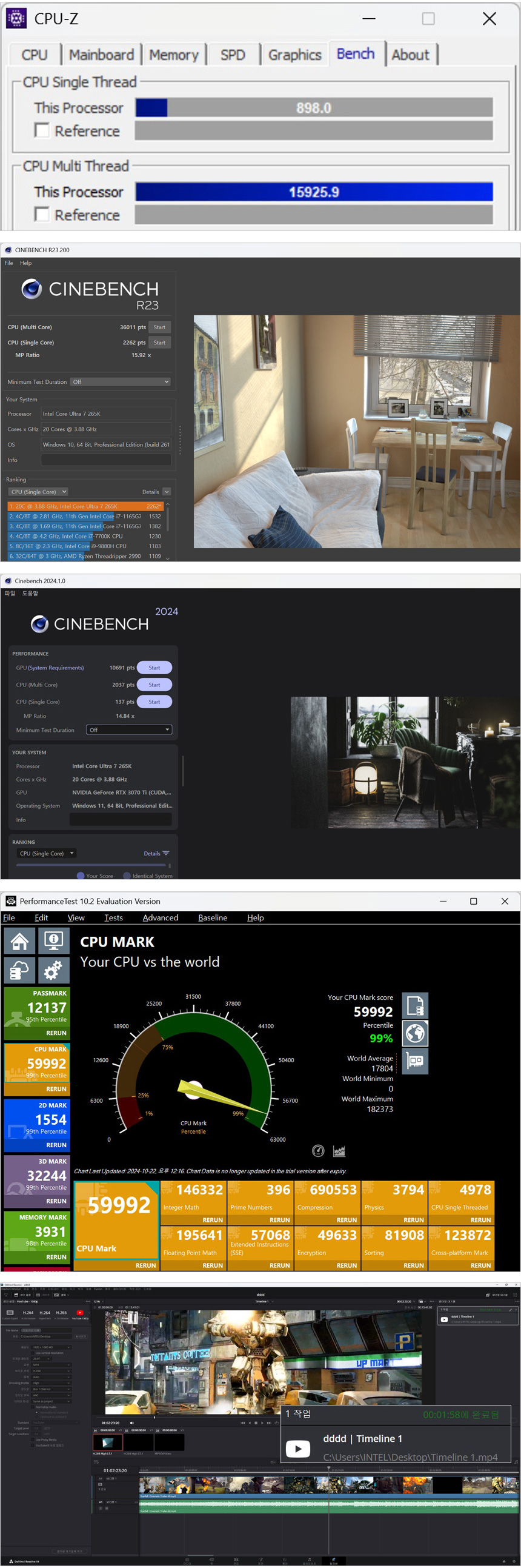 벤치마크 프로그램과 영상편집 프로그램을 이용해 성능 테스트를 진행하고 있는 모습으로 높은 스코어를 보여주었다. (14세대 인텔코어 i7-14700K 대비 싱글스레드는 대동소이 하며 멀티스레드 성능은 높아진 것을 확인할 수 있다.) 또한 영상편집 랜더링 시간도 10초 이상 단축되었다.