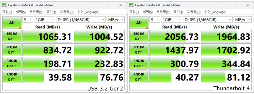 썬더볼트 4 와 USB 3.2 Gen2x2 단자를 지원해 초고속 데이터 전송이 가능하다. 상단의 사진은 USB 3.2 Gen2x2 지원 외장 SSD를 장착해 속도 테스트를 진행하고 있는 모습으로 2,000MB/s 가 넘어가는 빠른 속도를 보여주었다. (USB 3.2 Gen2x2를 지원하는 외장 SSD를 사용해야 최대 속도를 즐길 수 있다. 외장 SSD 구입시 지원 스펙을 확인하기 바란다.)