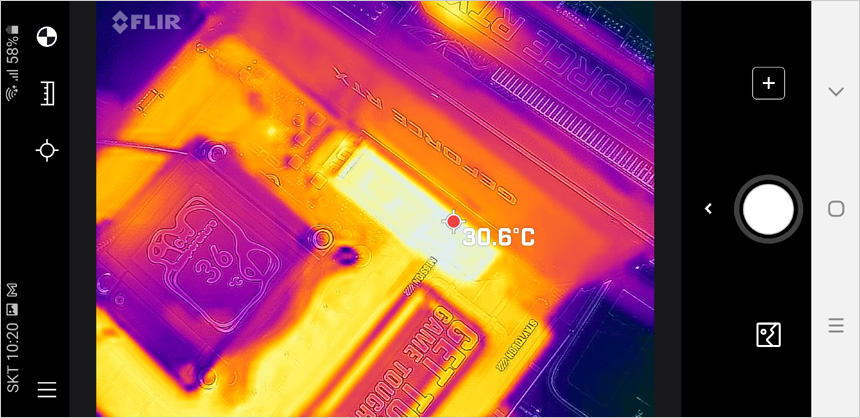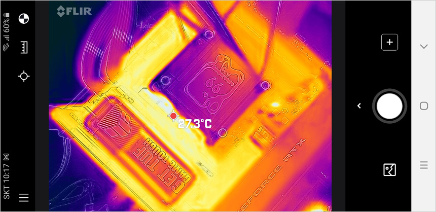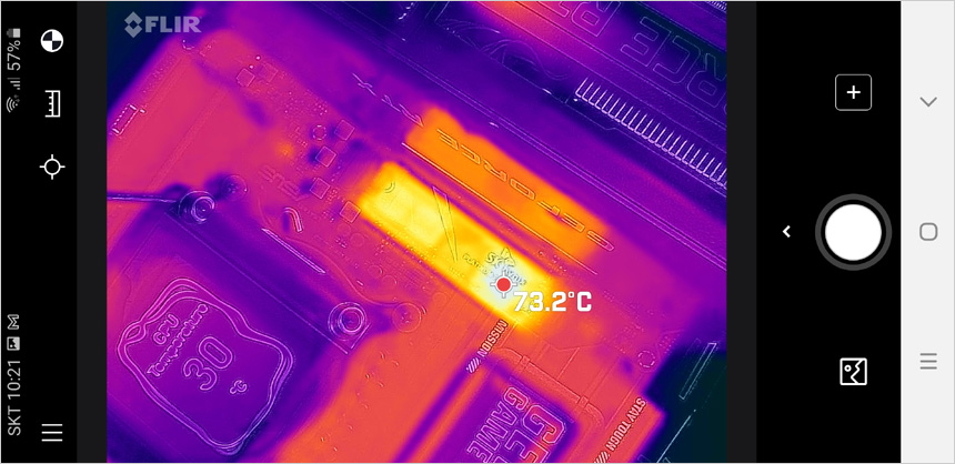 CPU와 전원부가 가장 바쁘게 작동하는 벤치마크를 실행한 상태에서 열화상 카메라를 이용해 표면의 열을 확인하고 있는 모습으로 (실내온도 14도) 두꺼운 히트싱크가 장착되어 과도하게 온도가 오르지 않는 것을 확인할 수 있다. (고성능 CPU를 사용할 경우 좋은 메인보드를 사용해야 하는 이유이다.)