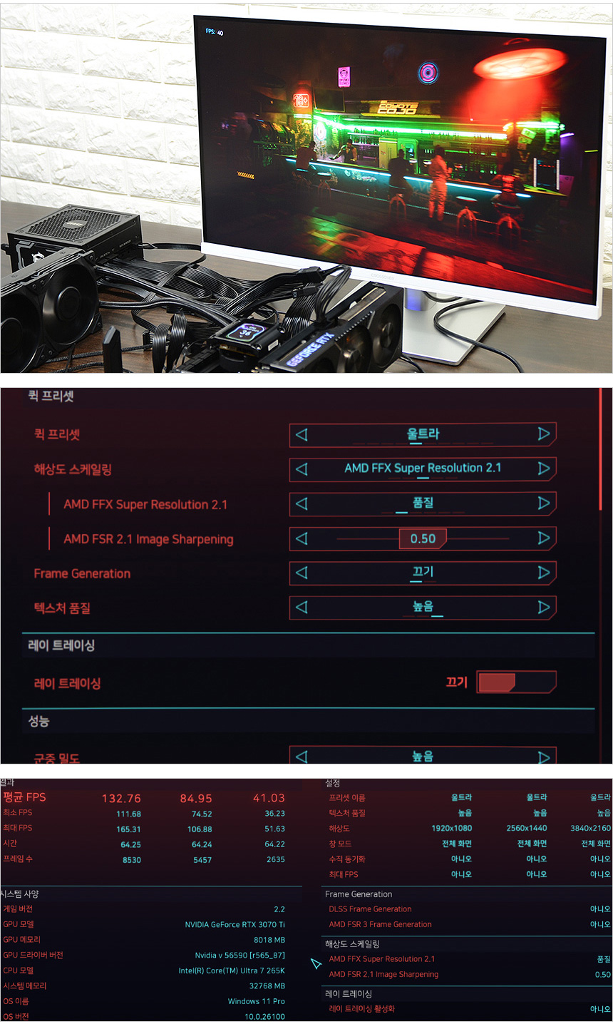 싸이버펑크 2077 벤치마크를 실행한 모습으로 4K 해상도에서도 원활하게 게임 플레이가 가능한 프레임을 보여주었다. RTX 4070 이상의 최고급형 그래픽카드를 사용하면 훨씬 높은 프레임으로 부드럽게 게임을 즐길 수 있을 것이다.
