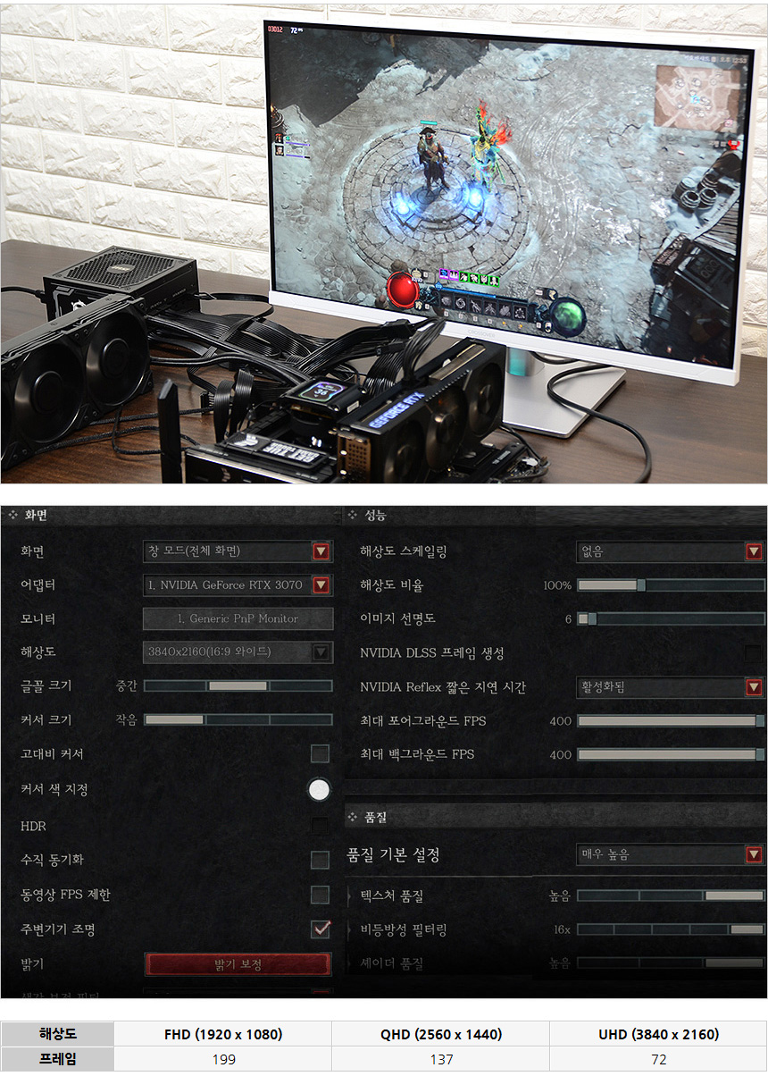 디아블로 4를 이용해 프레임 테스트를 진행한 모습으로 (키오바샤드에서 측정) 프레임이 상당히 높은 것을 확인할 수 있었다. 해상도나 옵션에 관계없이 부드럽게 게임을 즐길 수 있다. @ 맵이나 낮/밤 유무에 따라 프레임이 달라진다. 이점 참조 바란다.
