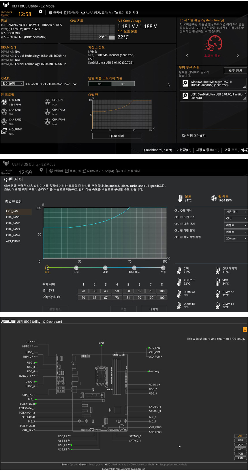 바이오스에 진입한 모습으로 (부팅시 DEL 키를 연타하면 바이오스에 진입할 수 있다.) 기본적인 시스템 상태 확인이 가능하며 Q팬제어와 Q대시보드를 지원해 팬속도를 조정할 수 있고 메인보드 구성을 편하게 확인할 수 있다. 또한 세부 메뉴에 들어가지 않고 XMP를 적용할 수 있으며 EZ 시스템 튜닝을 제공해 손쉽게 CPU를 오버클럭 할 수 있다.