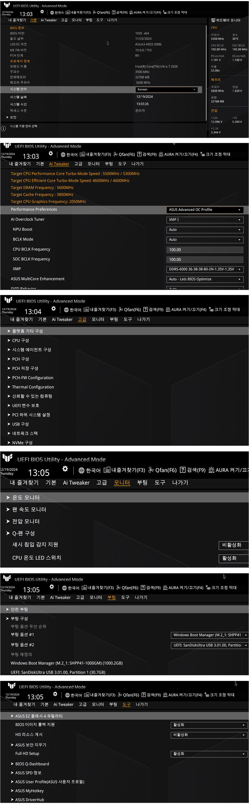 손쉽게 주요 기능을 설정할 수 있는 EZ 모드와 디테일한 환경 설정이 가능한 Advanced 모드를 선택할 수 있다. 상단의 사진은 어드벤스드 모드를 실행한 모습으로 CPU 와 메모리, 기타 환경을 디테일하게 설정하거나 오버클럭을 원활하게 할 수 있도록 다양한 메뉴가 제공된다.