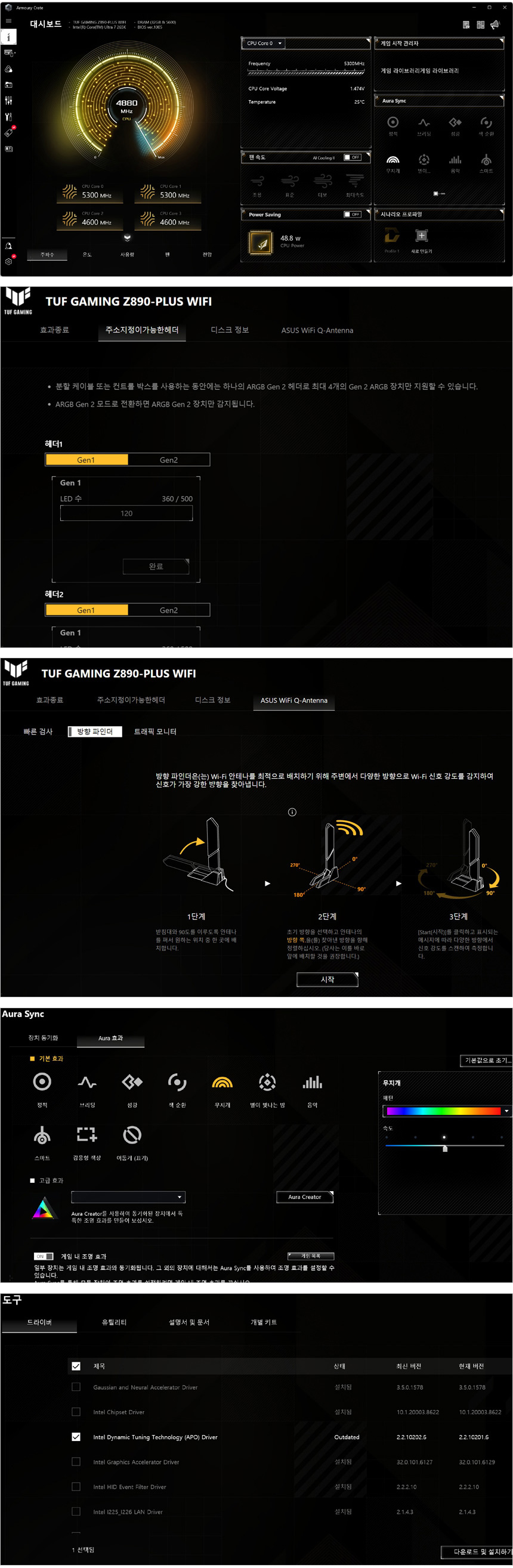 전문가 뿐만 아니라 초보자도 손쉽게 사용할 수 있는 구성도 칭찬하고 싶다. 이상적인 CPU 와 냉각성능을 예측하고 시스템의 성능을 최대로 끌어 올리는 AI 오버클러킹을 비롯해 온도에 따라 팬속도를 조절해 PC를 최적화 하는 동시에 소음을 줄이는 AI 쿨링 II, 네트워크 최적화로 원활한 연결을 보장하는 AI 네트워킹 II 등을 지원해 초보자도 편하게 시스템을 관리할 수 있으며 AI 특화된 인텔코어 울트라 프로세서의 NPU 부스트 기능을 지원해 (오버클럭을 통해 최대 24% 까지 성능을 높일 수 있다.) 다양한 AI 프로그램을 편하게 사용할 수 있다.
